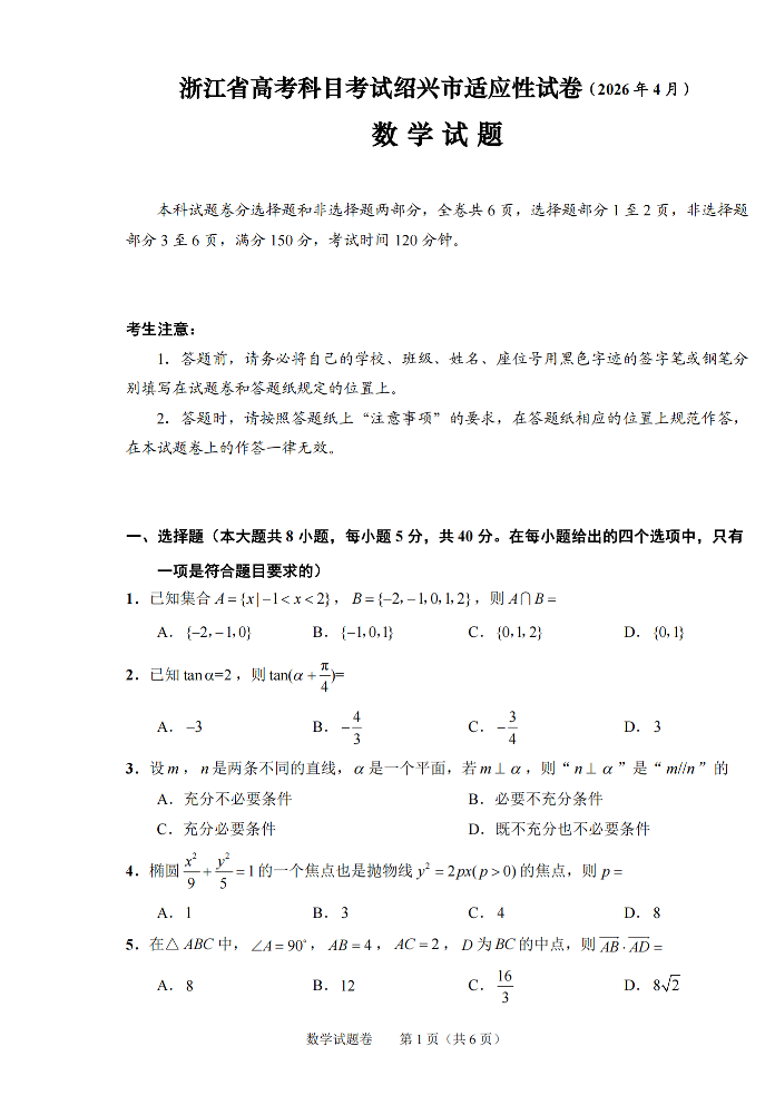 浙江省高考科目考试绍兴市适应性试卷 数学.pdf
