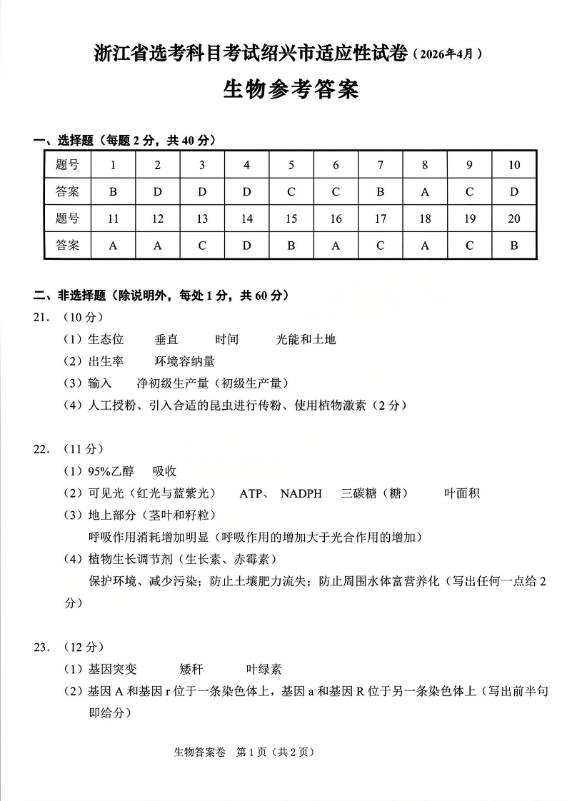 浙江省高考科目考试绍兴市适应性试卷 生物答案.pdf