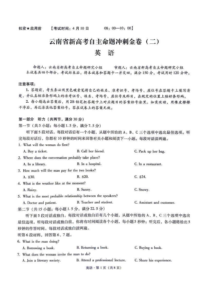 云南省新高考自主命题冲刺金卷(二)英语试题(含答案).pdf