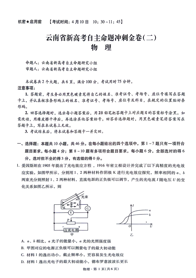 云南省新高考自主命题冲刺金卷(二)物理试题(含答案).pdf