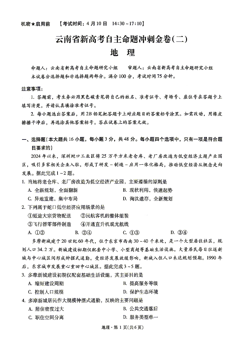 云南省新高考自主命题冲刺金卷(二)地理试题(含答案).pdf