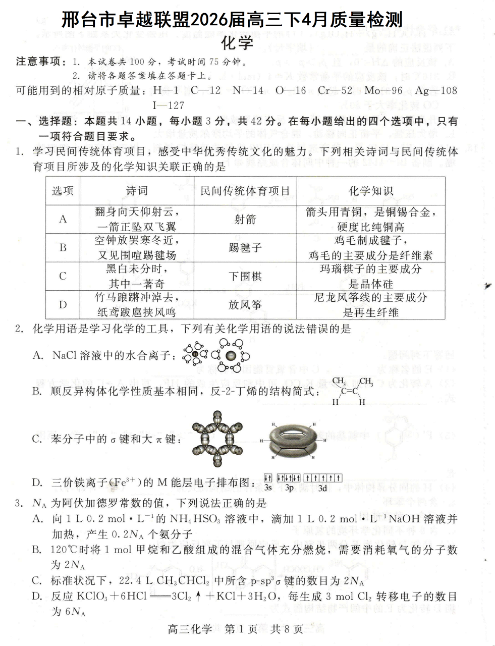 邢台市卓越联盟2026届高三下4月质量检测 化学.pdf