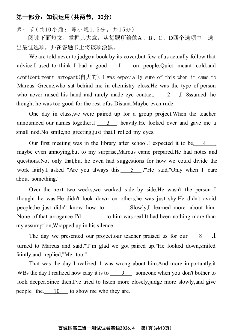 北京市西城区2026年高三年级统一测试试卷 英语试题(含答案).docx