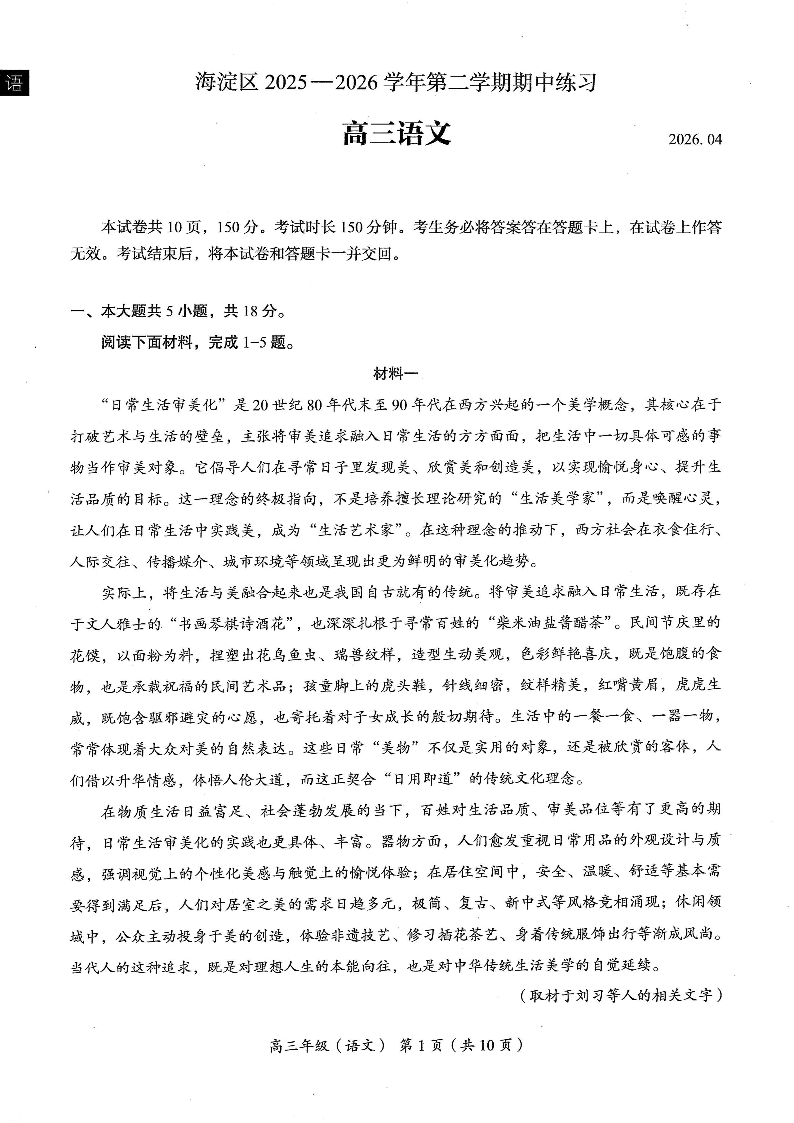 北京市海淀区2025-2026学年第二学期高三年级期中练习 语文试题(含答案).pdf