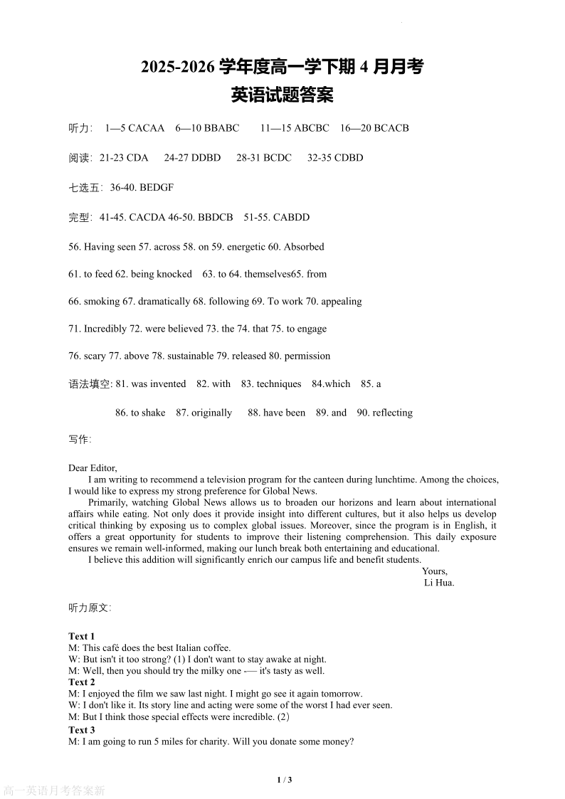 哈尔滨师范大学附属中学2025-2026学年高一下学期4月月考 英语答案.pdf