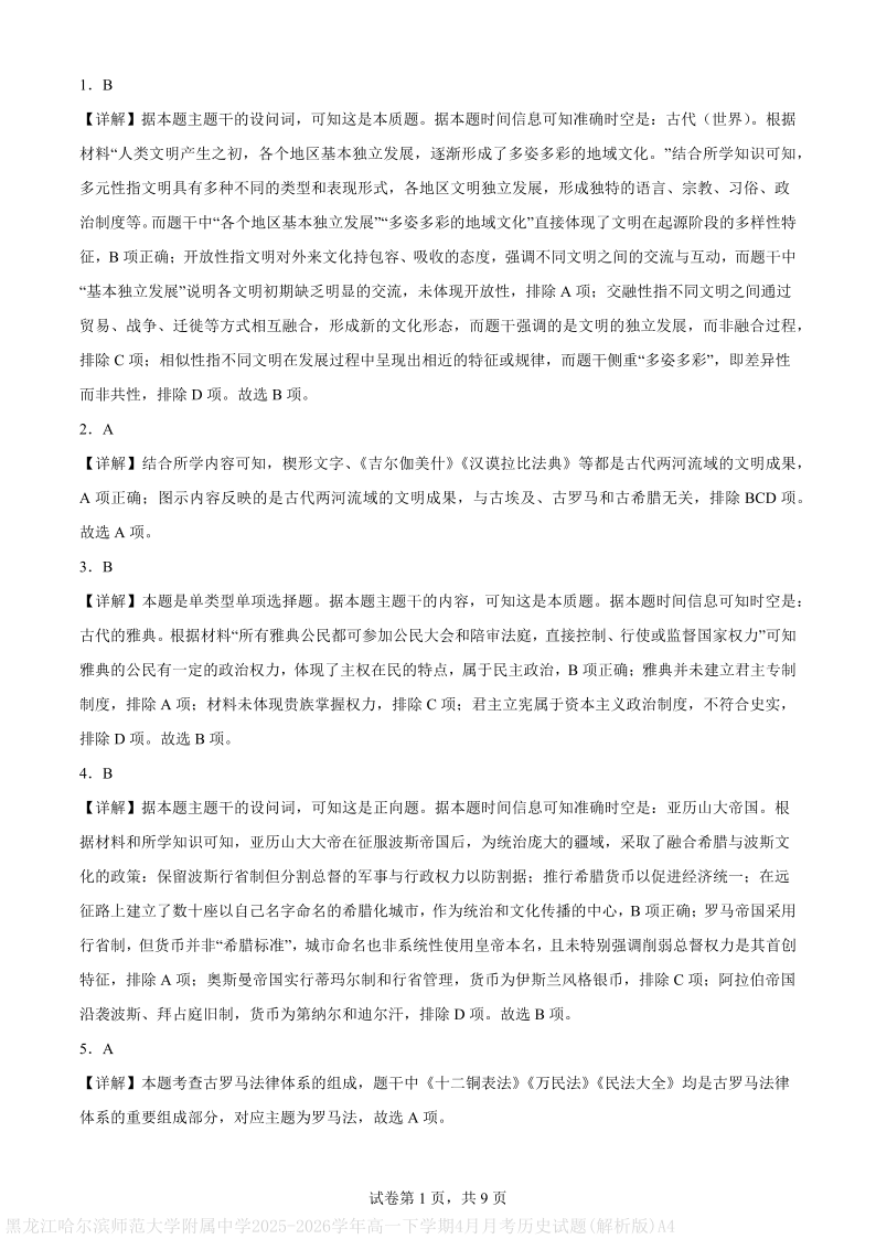 哈尔滨师范大学附属中学2025-2026学年高一下学期4月月考 历史答案.pdf