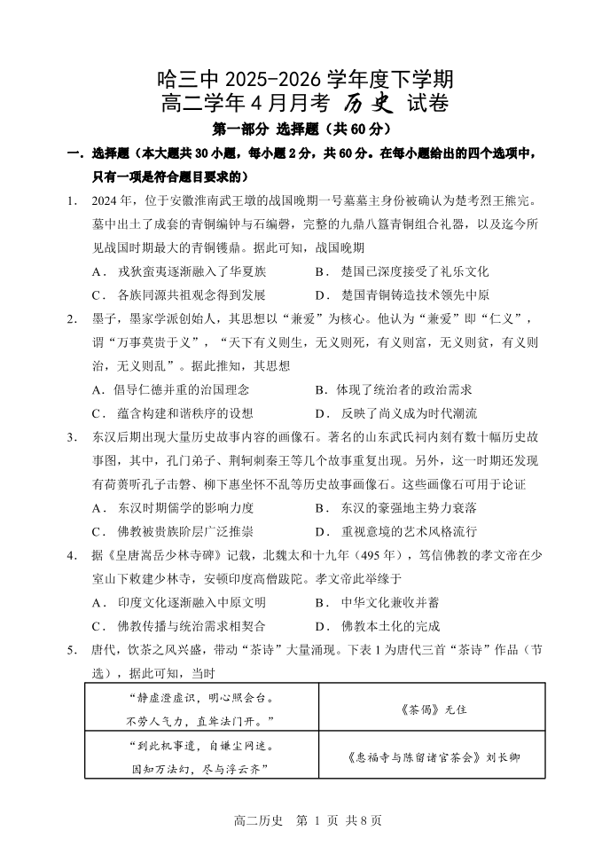 哈三中2025-2026学年度下学期高二学年4月月考 历史.pdf
