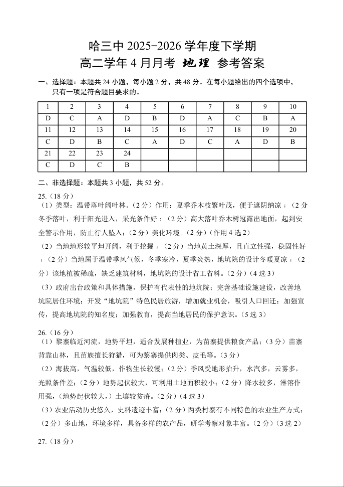 哈三中2025-2026学年度下学期高二学年4月月考 地理答案.docx