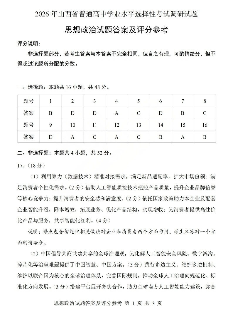 2026年山西省普通高中学业水平选择性考试调研试题 政治答案.pdf