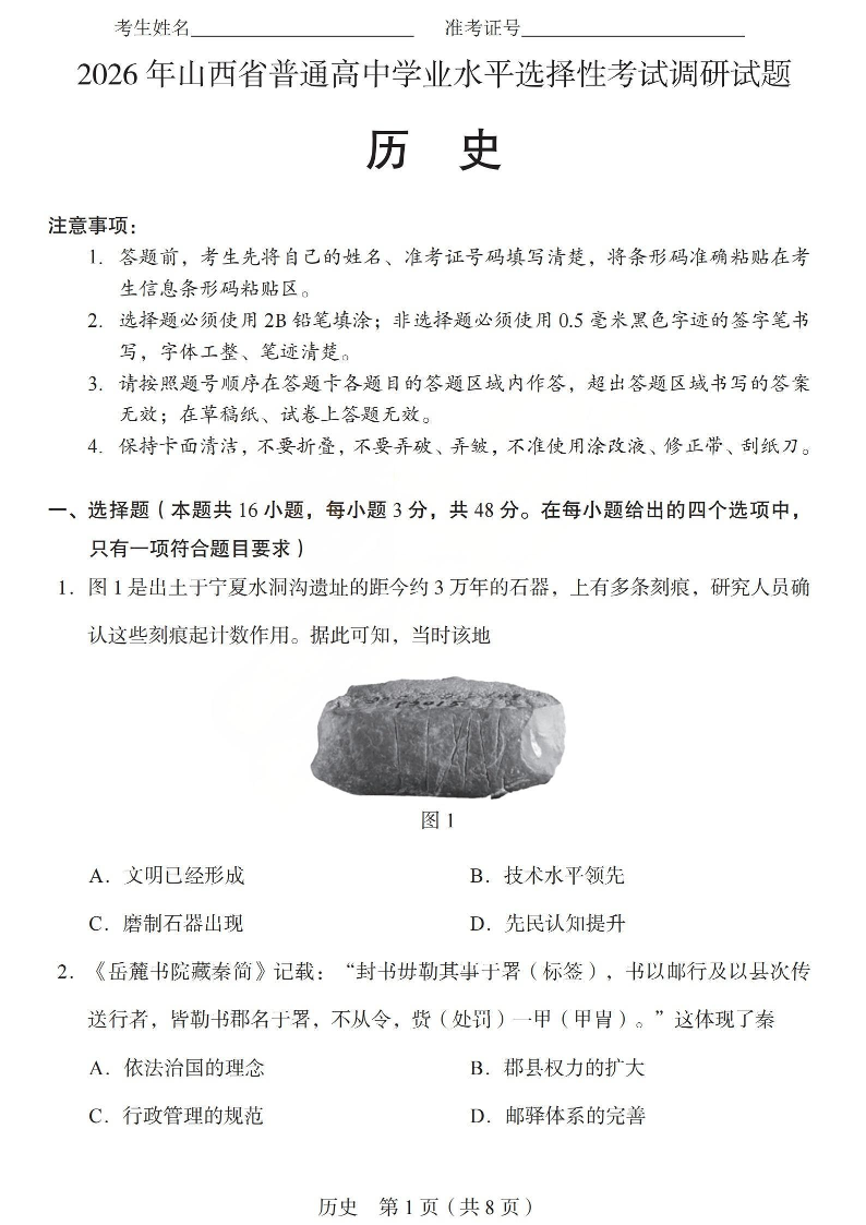 2026年山西省普通高中学业水平选择性考试调研试题 历史.pdf