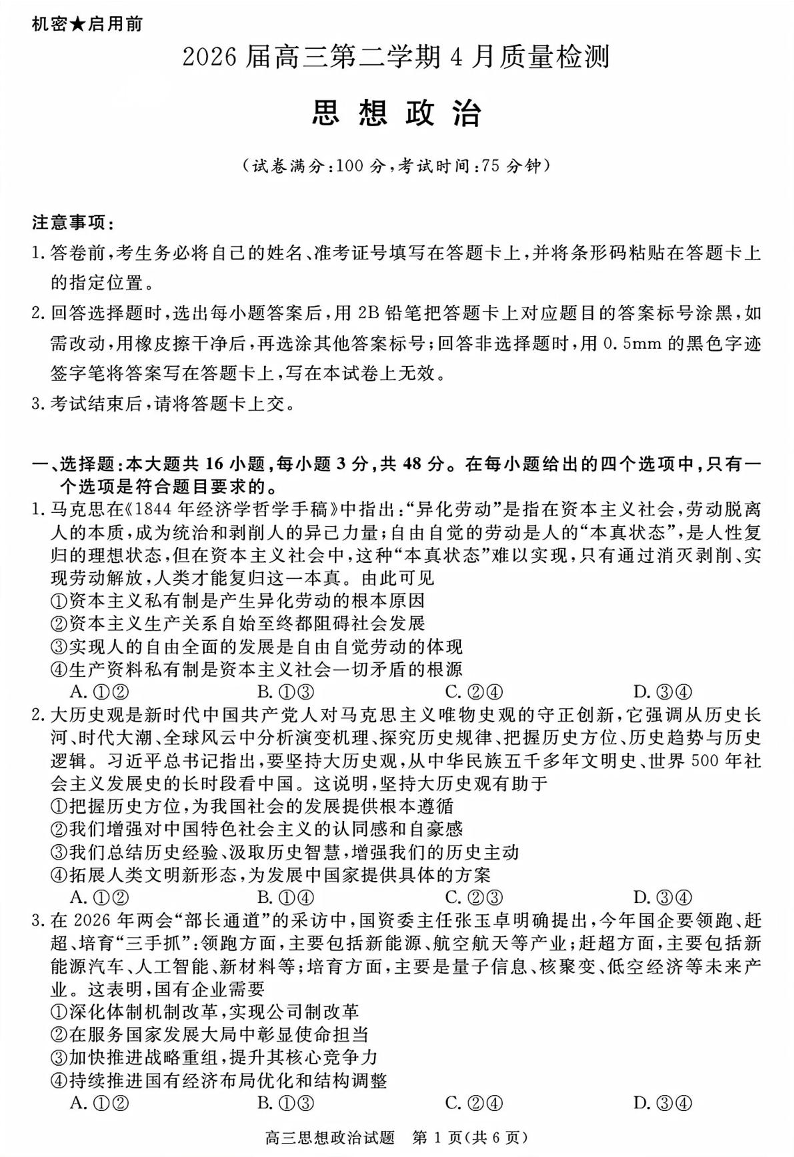 安徽华师联盟2026届高三第二学期4月质量检测 政治试题(含答案).pdf