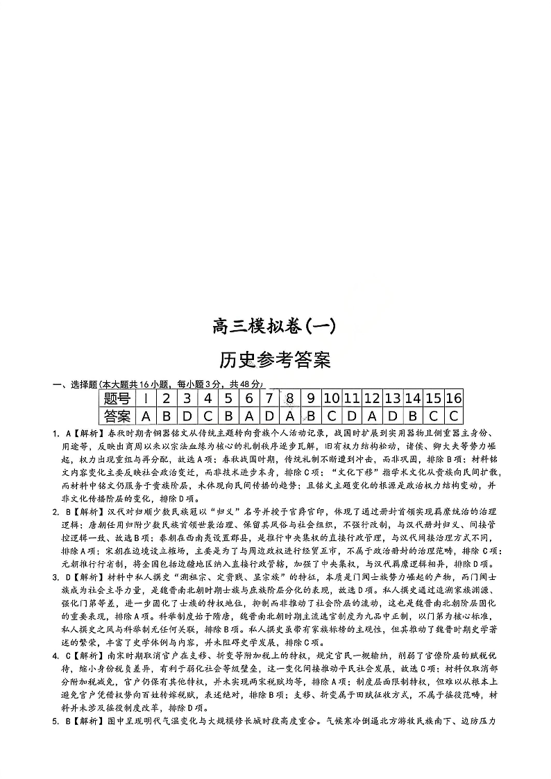 湖南师大附中2026届高三年级模拟卷(一)历史答案.pdf