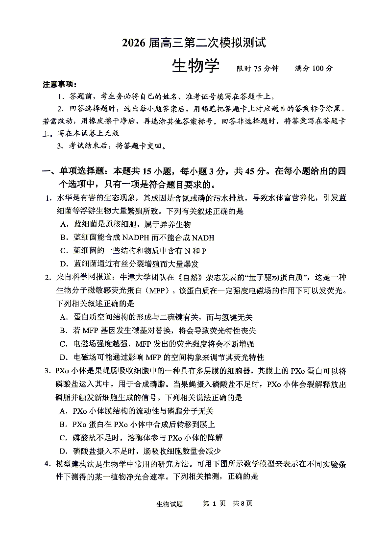 眉山市2026届高三第二次模拟测试 生物.pdf