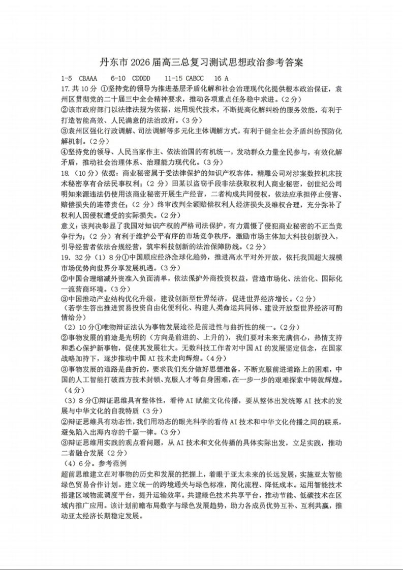 辽宁省丹东市2026届高三年级教学质量监测 政治答案.docx