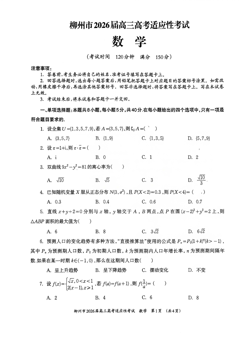 广西壮族自治区柳州市2026届高三年级高考适应性考试 数学.pdf