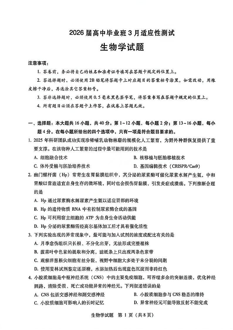 广西壮族自治区柳州市2026届高三年级高考适应性考试 生物.pdf