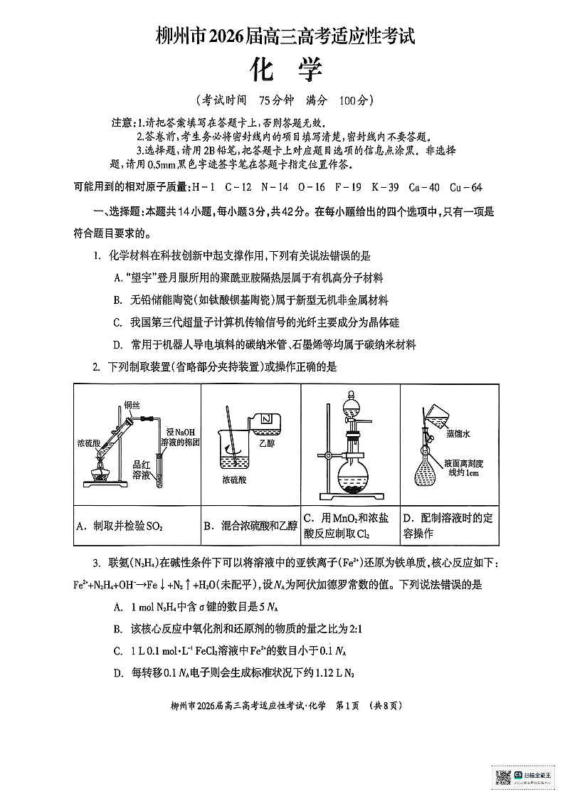 广西壮族自治区柳州市2026届高三年级高考适应性考试 化学.pdf