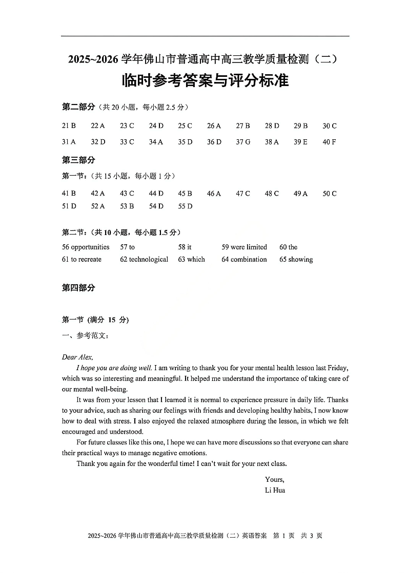 广东省2025-2026学年佛山市普通高中高三年级教学质量检测(二)英语答案.pdf