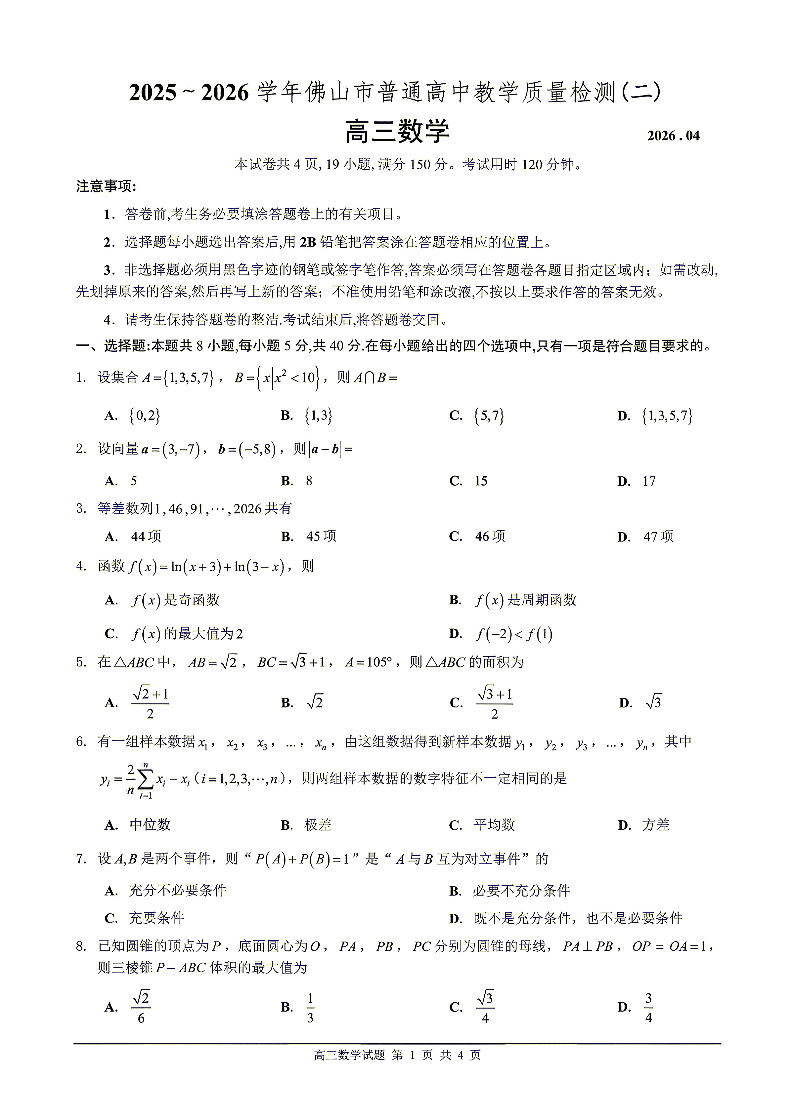广东省2025-2026学年佛山市普通高中高三年级教学质量检测(二)数学.pdf