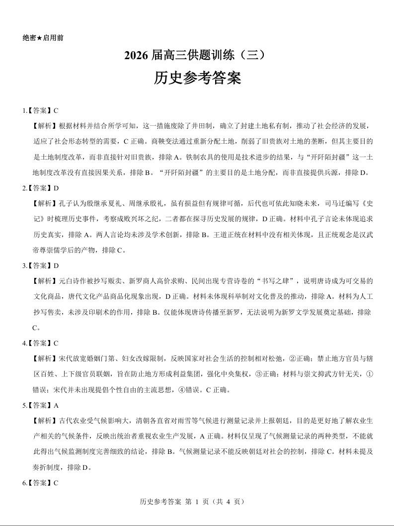 2026届高三供题训练(三)历史参考答案.docx