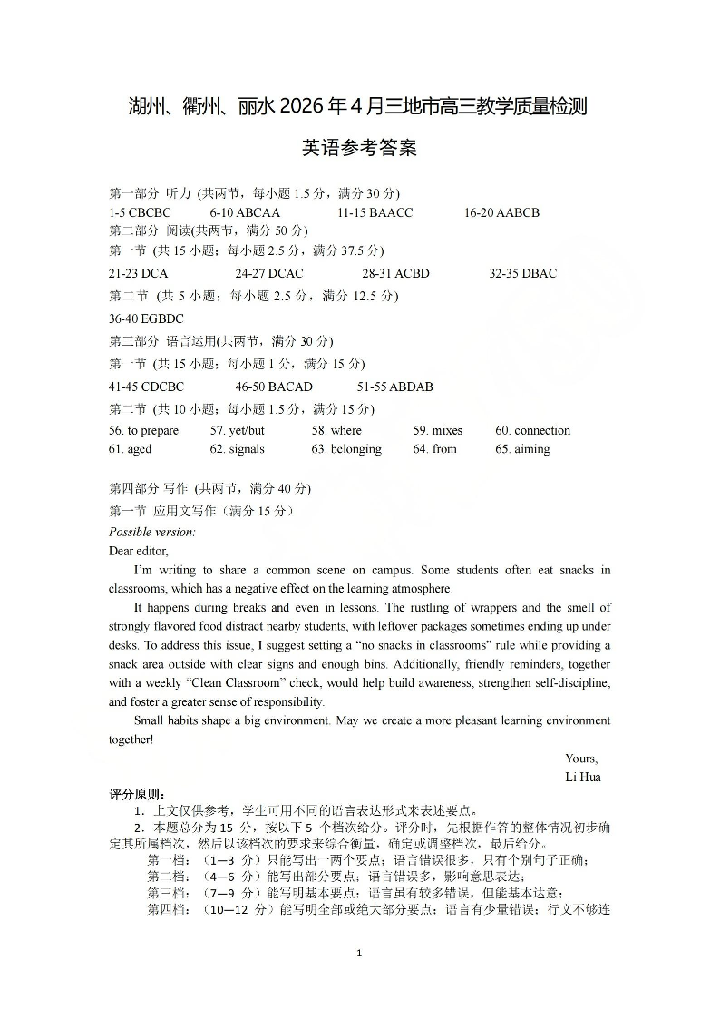 湖州、衢州、丽水2026年4月三地市高三教学质量检测 英语答案.pdf