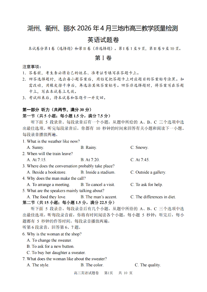湖州、衢州、丽水2026年4月三地市高三教学质量检测 英语.pdf