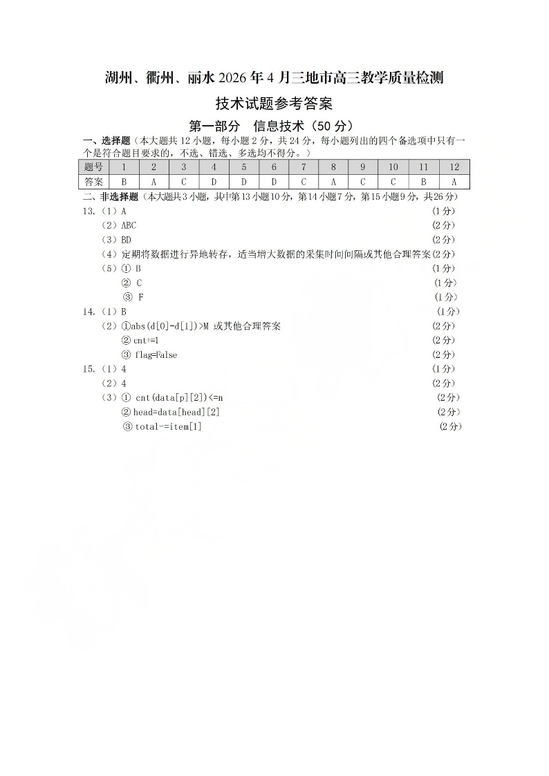 湖州、衢州、丽水2026年4月三地市高三教学质量检测 技术答案.pdf