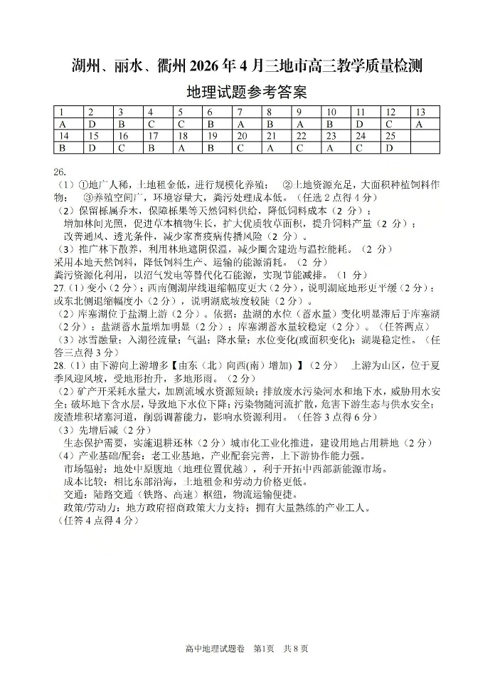 湖州、衢州、丽水2026年4月三地市高三教学质量检测 地理答案.pdf