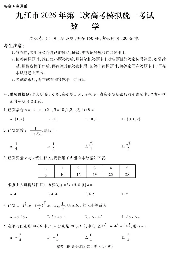 九江市2026年第二次高考模拟统一考试 数学.pdf
