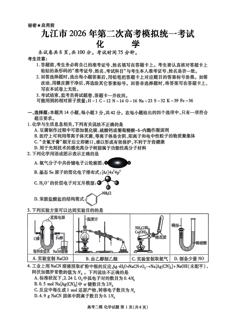 九江市2026年第二次高考模拟统一考试 化学.pdf