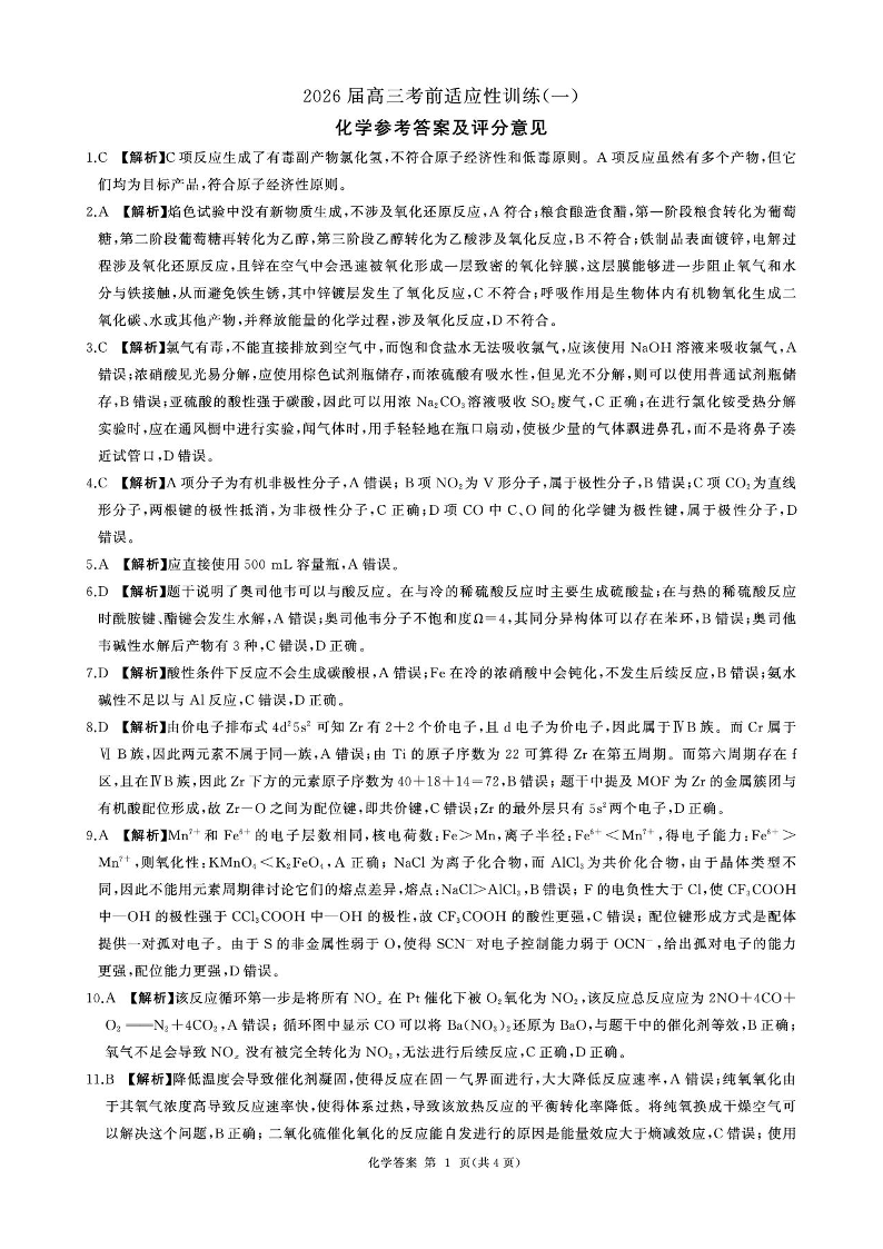百师联盟2026届高三下学期考前适应性训练(一)化学答案.pdf