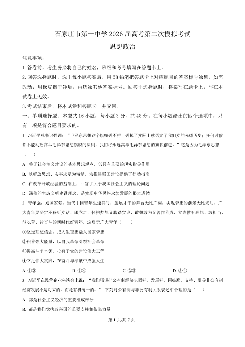 石家庄市第一中学2026届高考第二次模拟考试 政治.docx