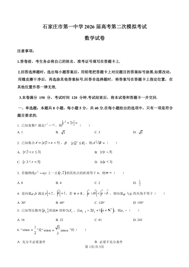 石家庄市第一中学2026届高考第二次模拟考试 数学.docx