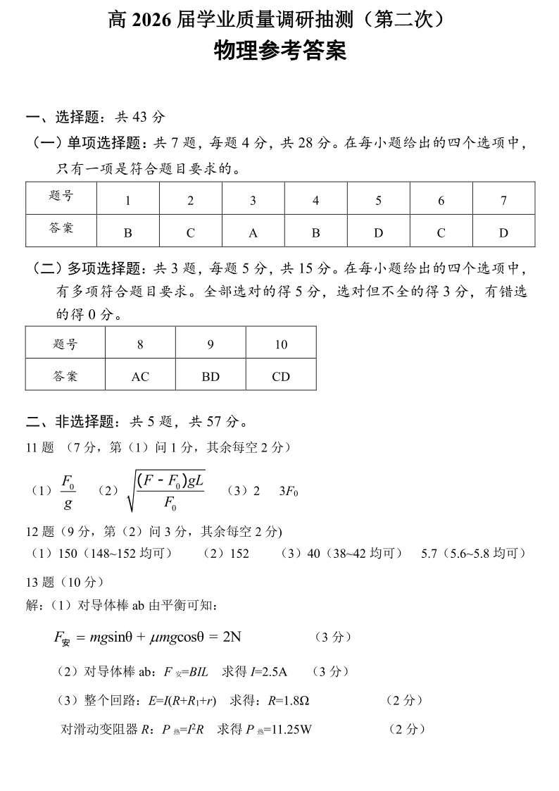 重庆九龙坡等区高2026届学业质量调研抽测 物理答案.pdf