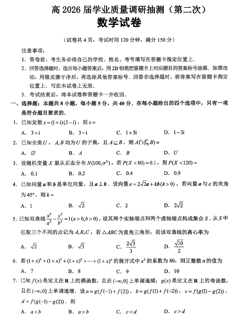 重庆九龙坡等区高2026届学业质量调研抽测 数学.pdf