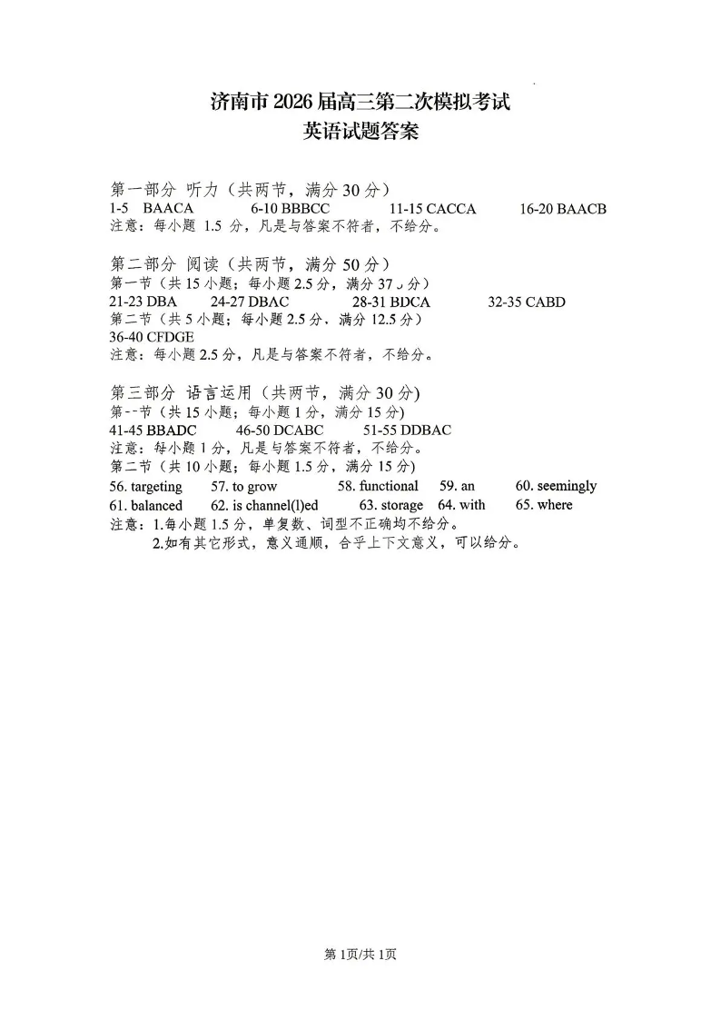 济南市2026届高三第二次模拟考试 英语答案.pdf