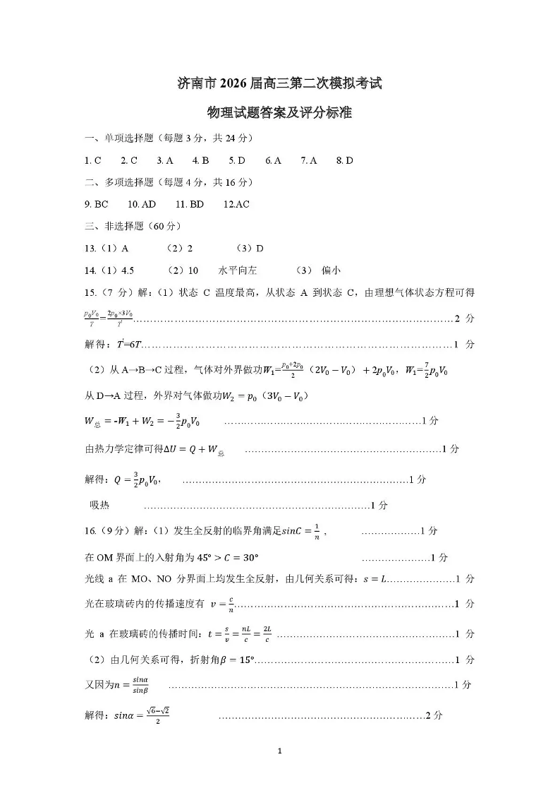 济南市2026届高三第二次模拟考试 物理答案.pdf