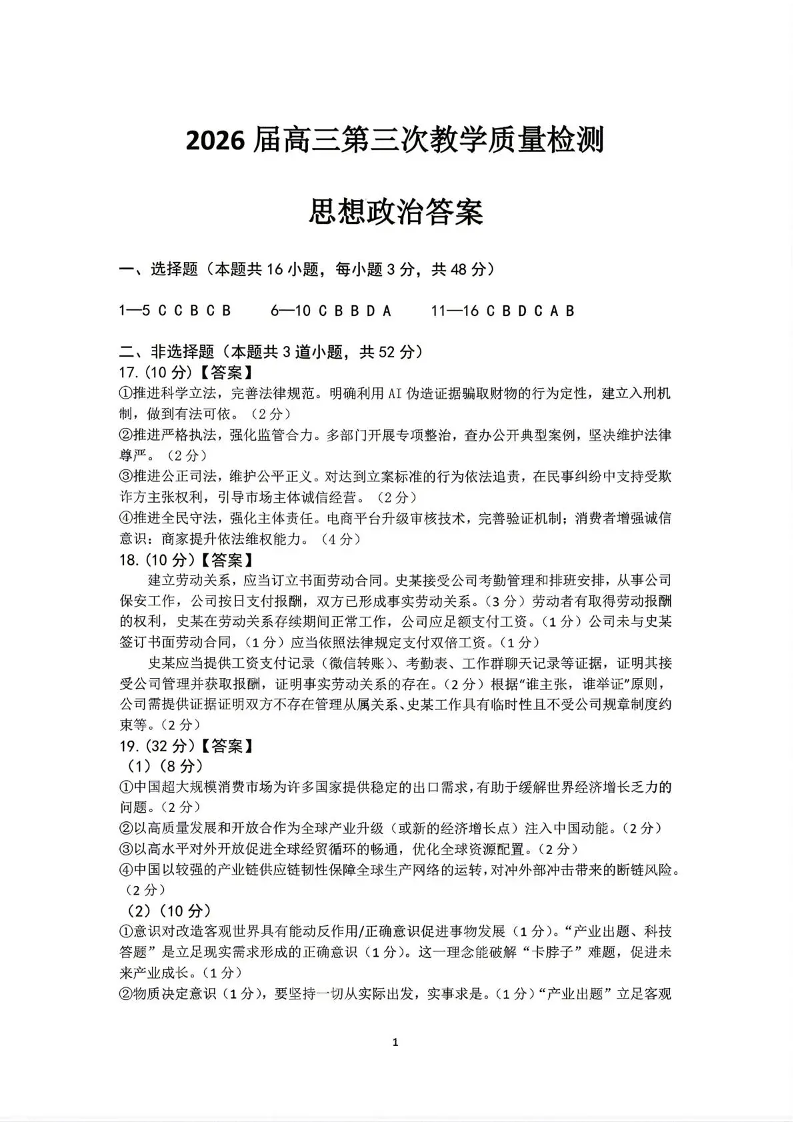 大庆市2026届高三年级第三次教学质量检测 政治答案.pdf