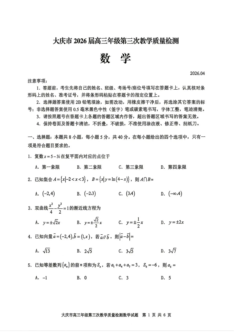 大庆市2026届高三年级第三次教学质量检测 数学.pdf