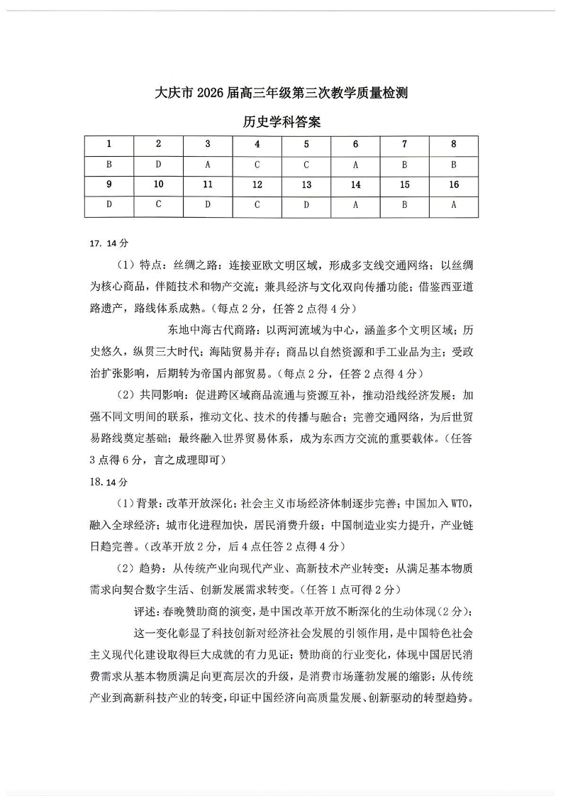 大庆市2026届高三年级第三次教学质量检测 历史答案.pdf