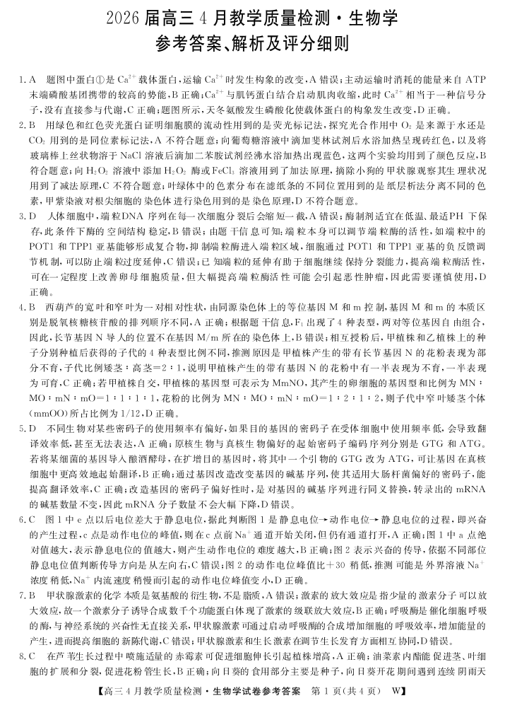 皖南八校2026届高三4月教学质量检测 生物答案.pdf