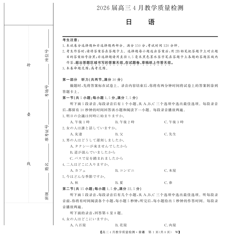 皖南八校2026届高三4月教学质量检测 日语.pdf