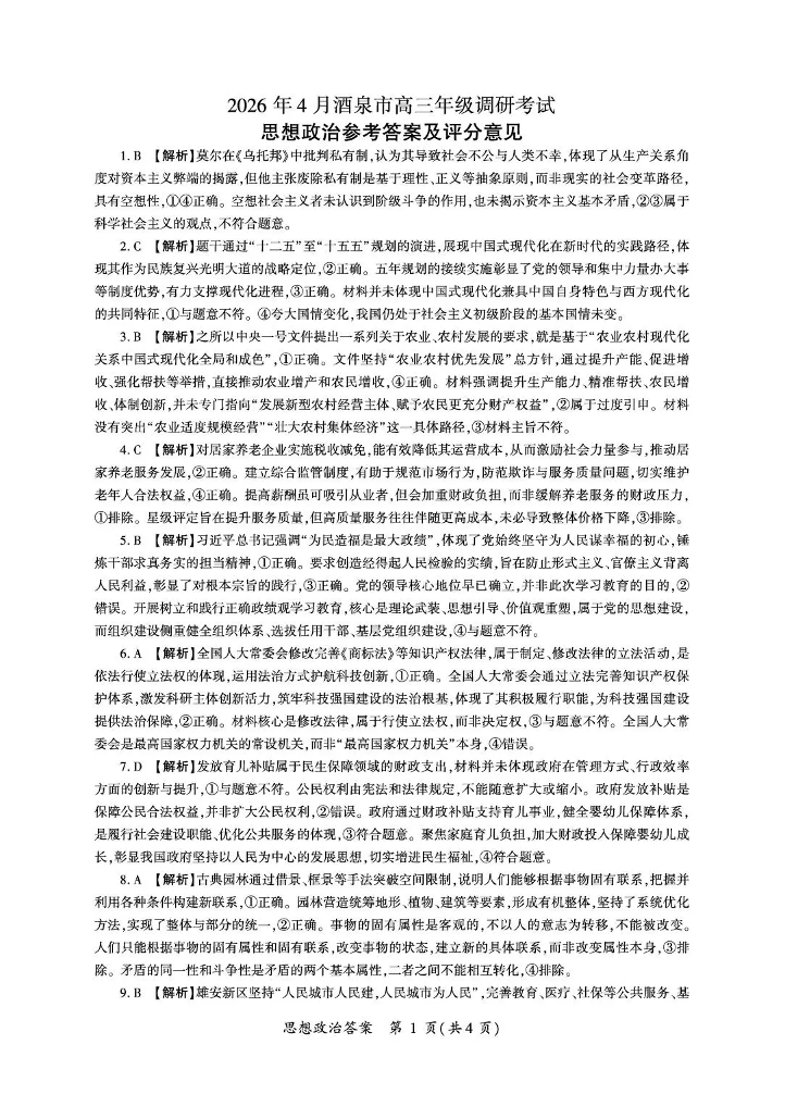 2026年4月酒泉市高三年级调研考试 政治答案.pdf