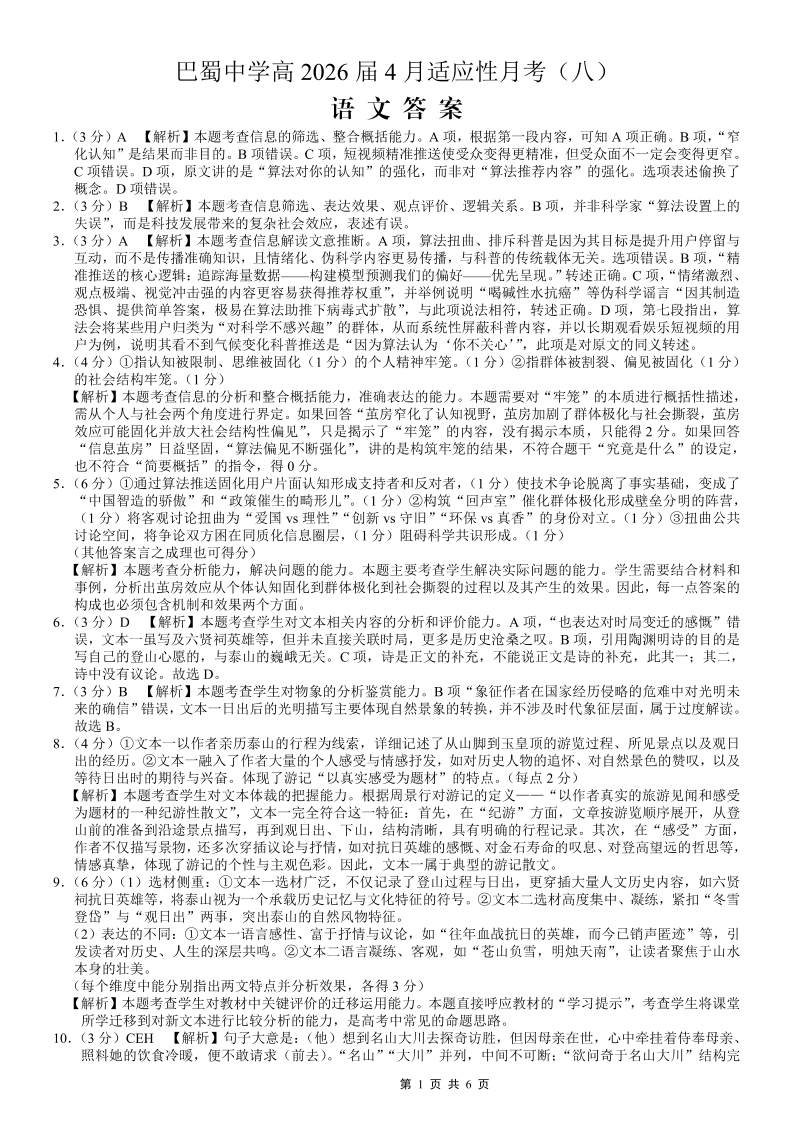 巴蜀中学2026届高考适应性月考卷(八)语文答案.pdf