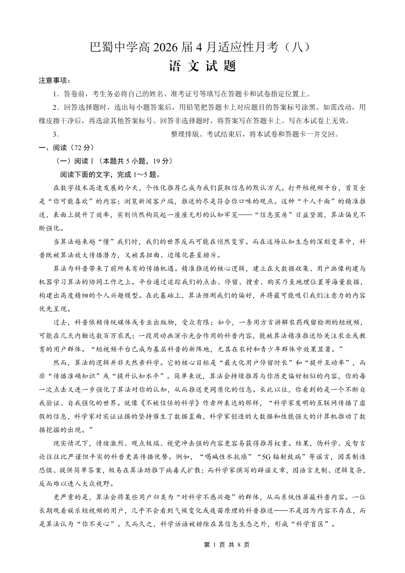 巴蜀中学2026届高考适应性月考卷(八)语文.pdf
