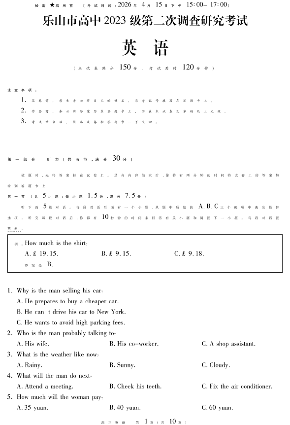 乐山市高中2023级第二次调查研究考试 英语.pdf
