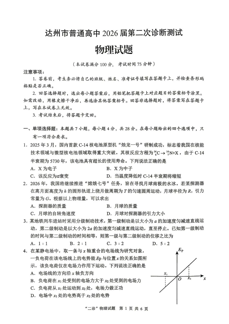 达州市普通高中2026届第二次诊断测试 物理.pdf