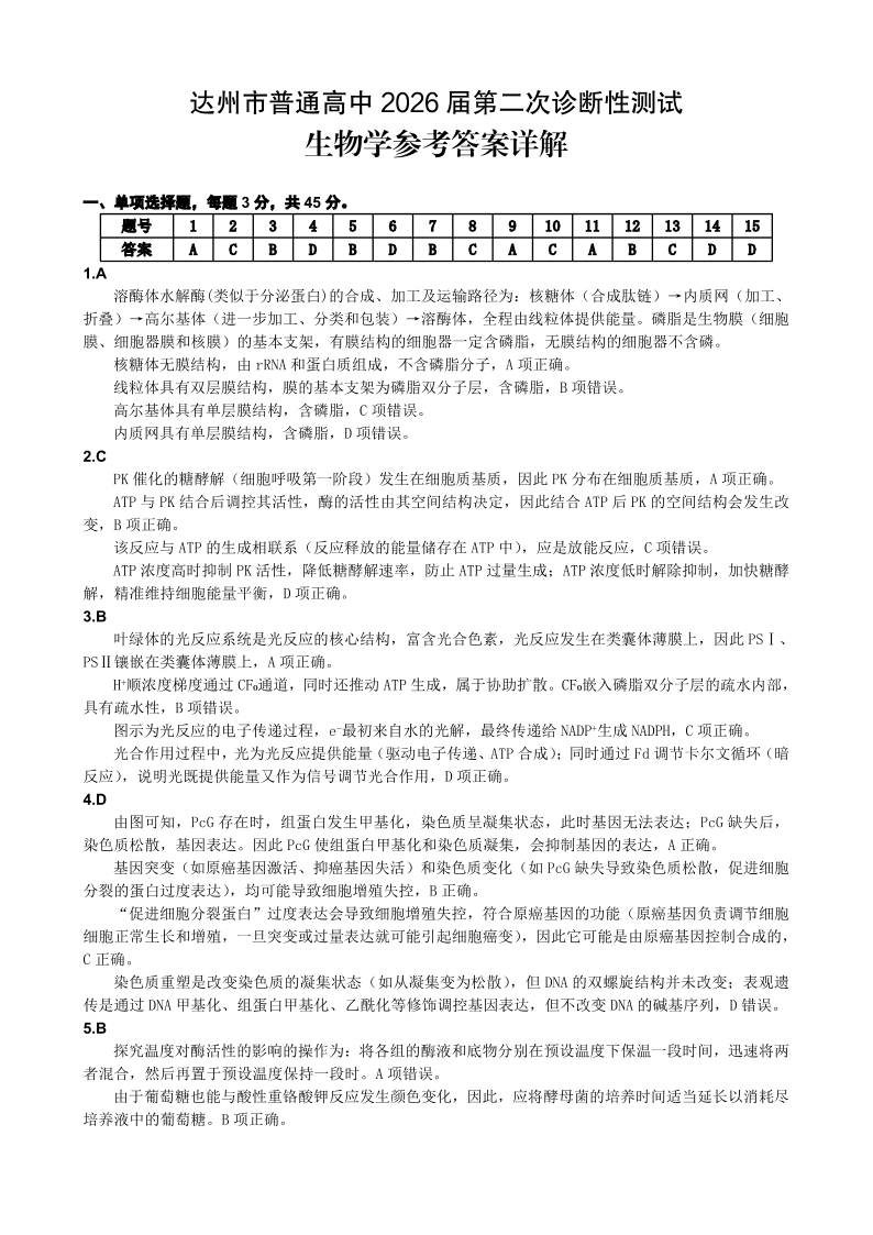 达州市普通高中2026届第二次诊断测试 生物答案详解.pdf
