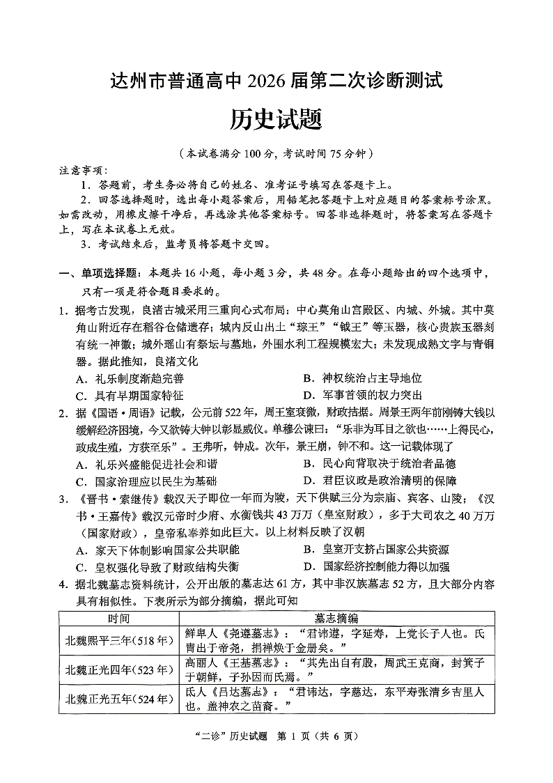 达州市普通高中2026届第二次诊断测试 历史.pdf