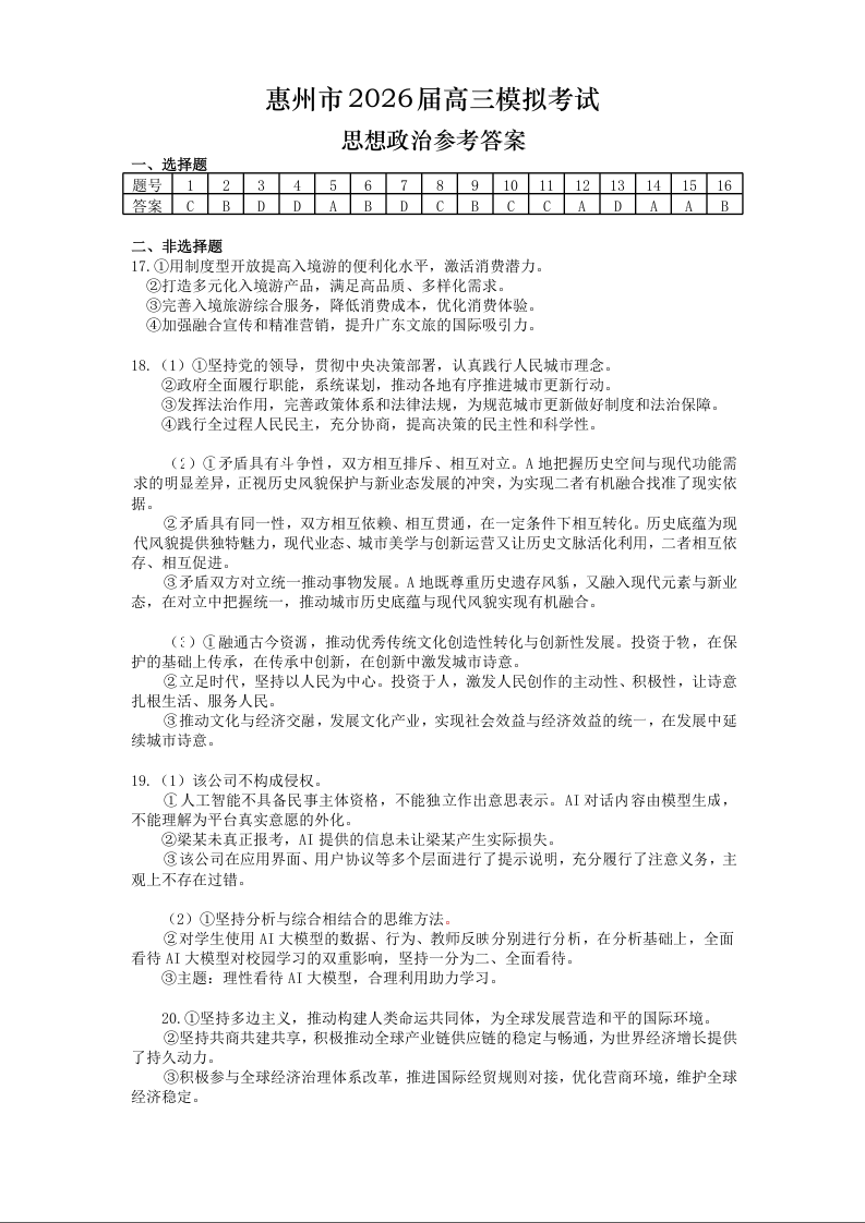 广东省惠州市、韶关市2026届高三4月练习 政治答案.docx